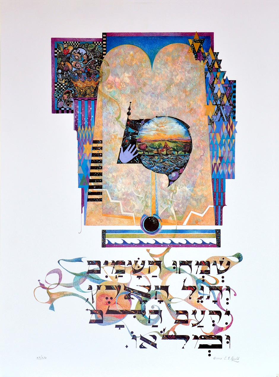 Within the body of the yud is a scene representing the heavens, earth and sea, and a hand (another meaning of yud). Egg shapes appear, symbolizing renewal – a theme of the psalm.