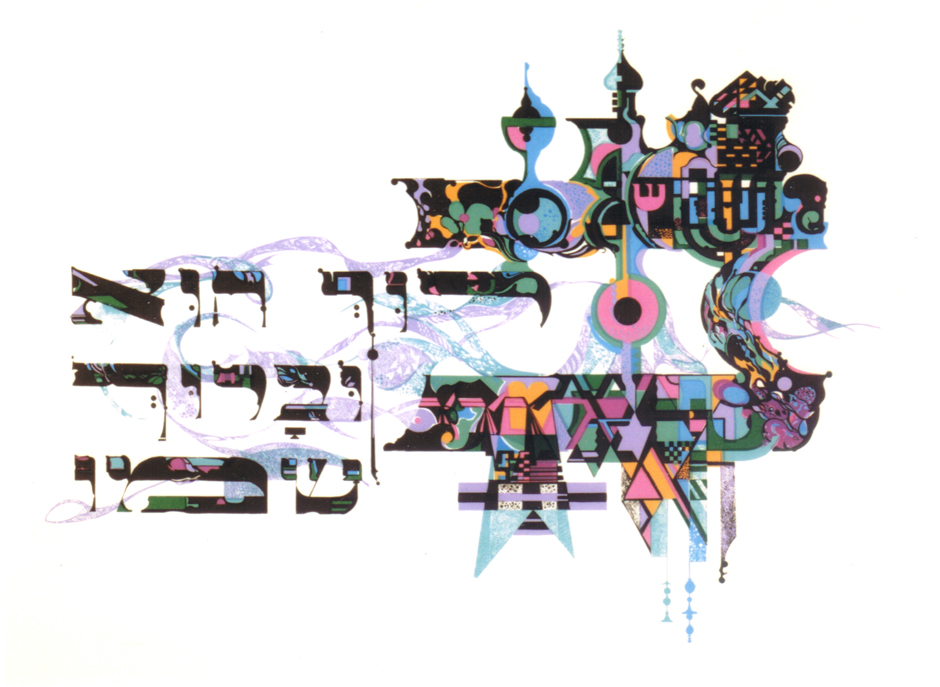 Suggestions of rimonim (pomegranates) both as fruits and Torah ornaments, the Tablets of the Law, the menorah, Stars of David, stylized palm trees (providers of food and shelter) and other symbols are included. The streamers tie the large initial letter to the smaller ones just as our people are connected to each other and to Hashem.