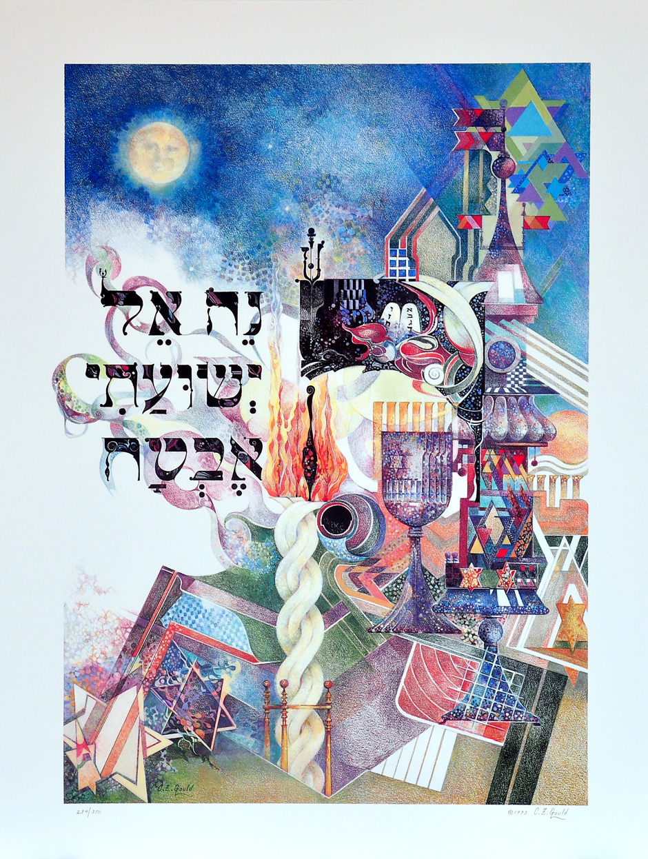 The setting sun is placed at the center far right. The moon and three stars in the upper left signal the conclusion of the Sabbath.